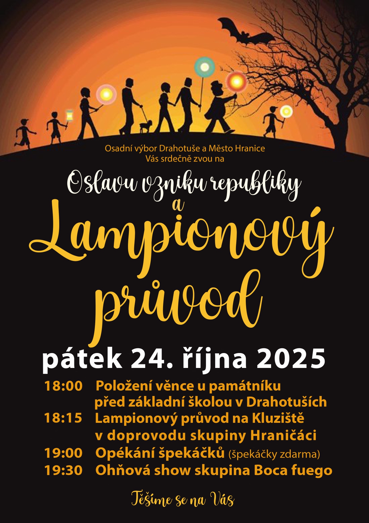 Osadní výbor Drahotuše a Město Hranice Vás srdečně zvou na Oslavu vzniku republiky a LAMPIONOVÝ PRŮVOD v pátek 25. října 2024 od 17:30 hod. položením věnce u památníku před základní školou odkud se vydáme lamionovým průvodem na Kluziště, kde je možnost opékání špekáčků a na závěr se můžeme těšit na OHŇOSTROJ