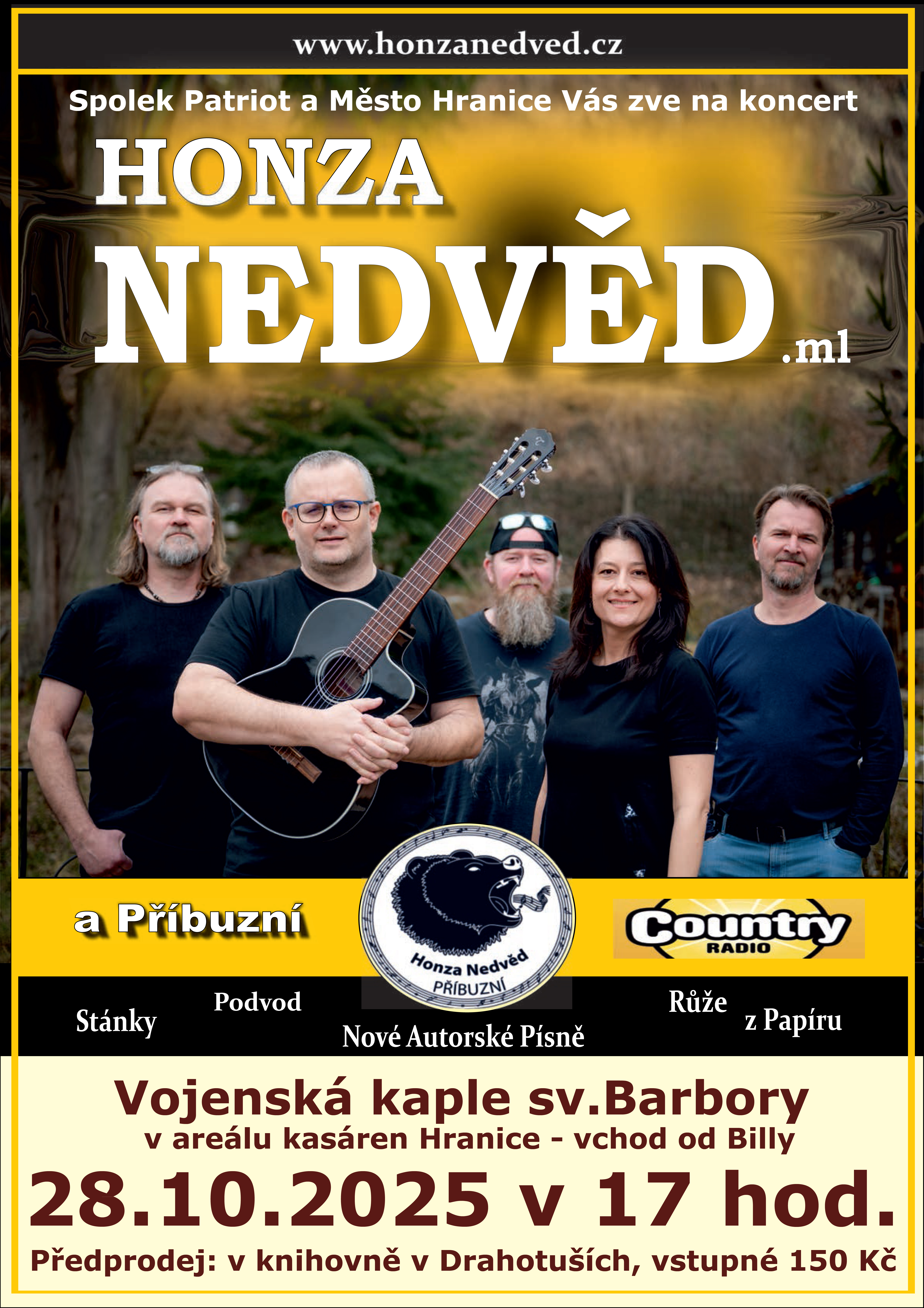 Spolek PATRIOT Vás srdečně zve na koncert skupiny POUTNÍCI v pondělí 28. října 2024 v 17 hodin v kostele sv. Vavřince v Drahotuších na náměstí.