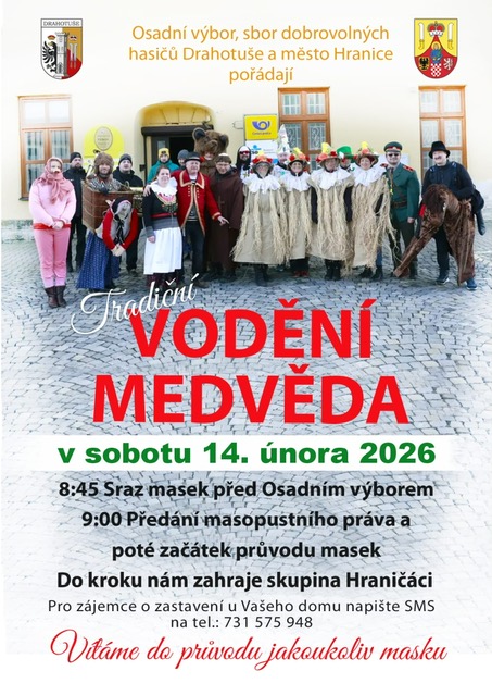 Osadní výbor Drahotuše, SDH a Město Hranice Vás srdečně zvou na tradiční VODĚNÍ MEDVĚDA v sobotu 8.2.2025.